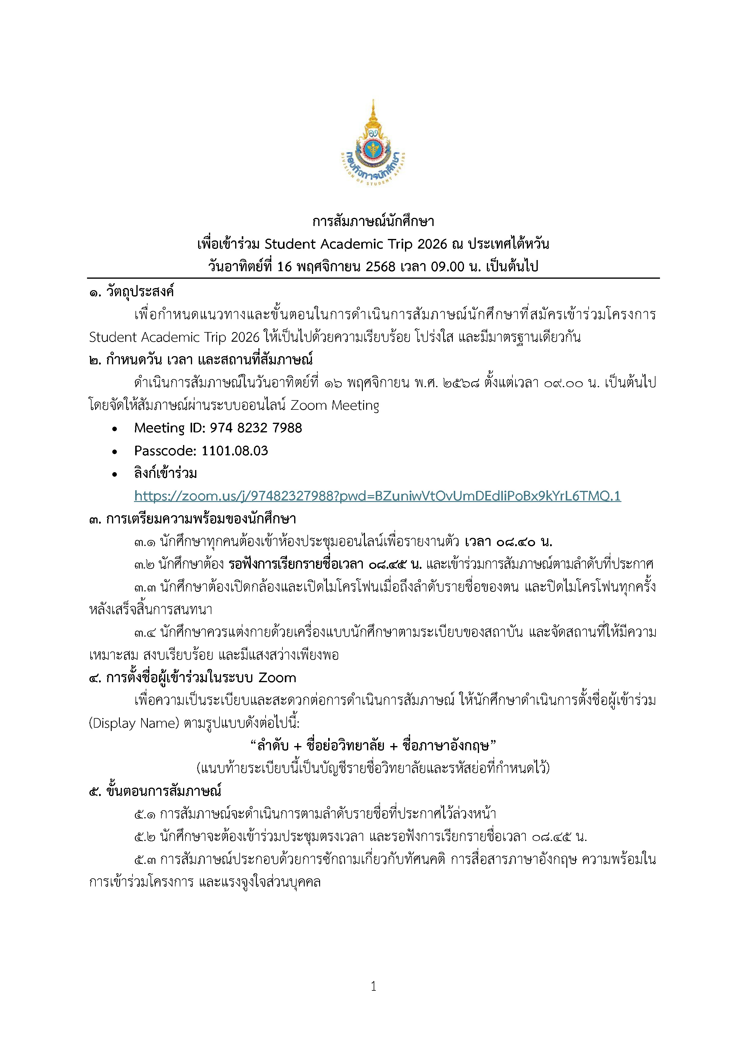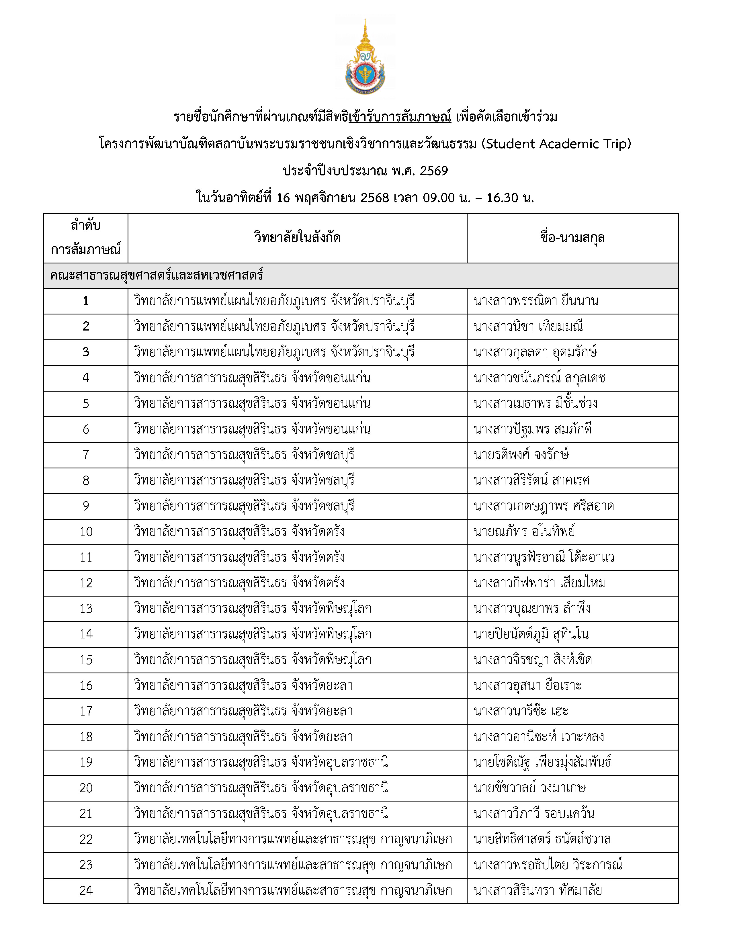 ประกาศรายชื่อนักศึกษาที่ผ่านเกณฑ์มีสิทธิเข้ารับการสัมภาษณ์ เพื่อคัดเลือกเข้าร่วมโครงการพัฒนาบัณฑิตสถาบันพระบรมราชชนกเชิงวิชาการและวัฒนธรรม (Student Academic Trip) ประจำปีงบประมาณ พ.ศ. 2569 ในวันอาทิตย์ที่ 16 พฤศจิกายน 2568 เวลา 09.00 น. – 16.30 น.