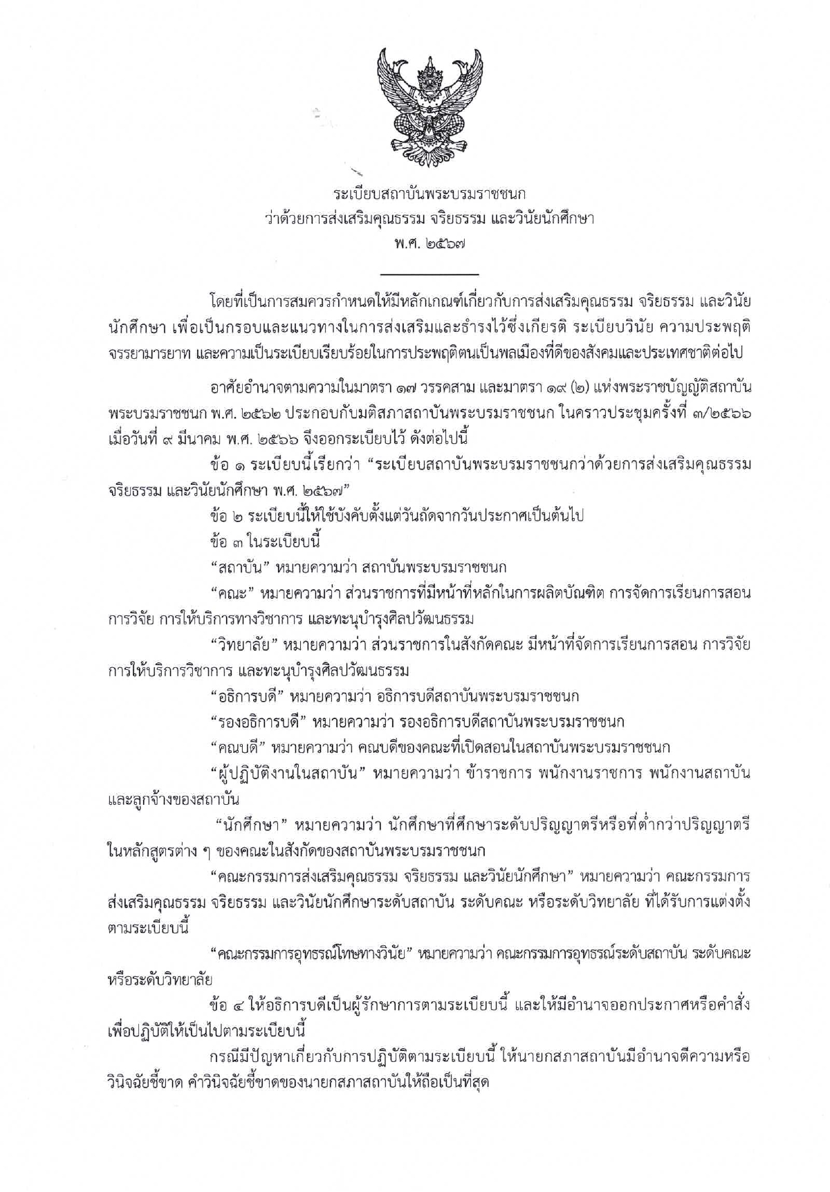 อ่านระเบียบ : ระเบียบสถาบันพระบรมราชชนกว่าด้วยการส่งเสริมคุณธรรม จริยธรรม และวินัยนักศึกษา พ.ศ. ๒๕๖๗